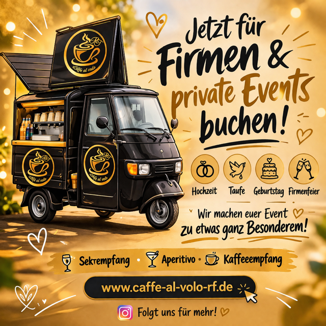 Mit unserem original italienischen Ape-Kaffeemobil bringen wir feinsten Kaffee aus Sizilien und professionelles Barista-Handwerk zu Ihren Events. Ob Firmenevent, Geburtstag oder Hochzeitsfeier – wir machen Ihre Veranstaltung zu einem besonderen Erlebnis.